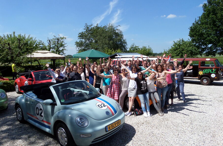 Beetle Cabrio 't Groene hart organizes company outings, team building and group outings based on a beautiful, challenging rally / puzzle tour with Cabrio New Beetles and Old Timer T2 Volkswagen hippie vans.