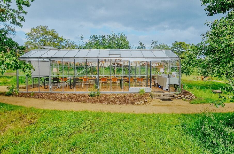 Be inspired by our charming conservatory, nestled in the heart of our orchard. This conservatory can accommodate 20 people for seated meetings. The conservatory is equipped with Wi-Fi, a large TV screen with all necessary connections, and a flipchart. Conservatory users can also use the covered area/tent, which can seat up to 40 people.