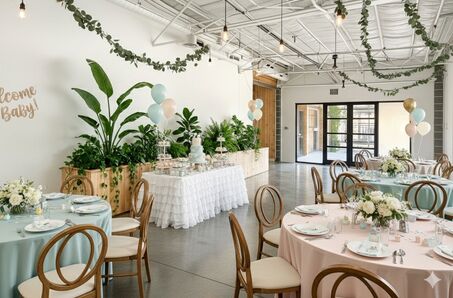 Our event hall spans 1,490 sq. ft. and can host up to 300 guests standing, 200 seated theater-style, or 100 in banquet/classroom format. Its modern space combines industrial charm with practical amenities, making it an ideal choice for both professional and social occasions. We provide flexible packages to suit your needs—from space-only rental with core utilities to full-service options including furniture setup, lounge areas, catering coordination, and vendor access. AV equipment is also available as an add-on.