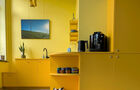 The space welcomes you with a cozy lounge and an adjoining sunny kitchen with really good coffee.