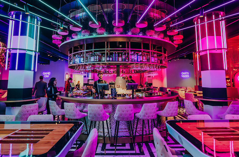 The All Out Amsterdam is the new hotspot for (corporate) events in Amsterdam. This revolutionary do-it-yourself F&B concept is the perfect place to gather, play activities, and enjoy the most delicious cocktails, bites, or walking dinners. From karaoke rooms to social darts, shuffleboard, shuffleboard, and an LED disco ball pit, there's something for everyone! With a vibrant and bold design, the venue invites you to immerse yourself in a world of color, creativity, and fun.