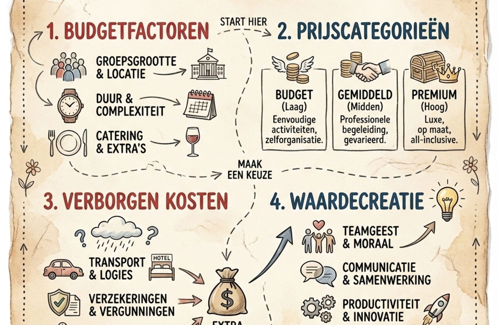 🛑 De verborgen kostenpost: TIJD. De grootste kostenpost die vaak vergeten wordt, is de interne planning (zie linksonder in de afbeelding). Urenlang zoeken naar locaties, restaurants bellen en routes uitstippelen... Time is money. Bij Geoteam nemen we die 'verborgen kost' weg. Wij regelen de organisatie, de begeleiding en de city game. Jij hoeft alleen maar op te dagen met je team.